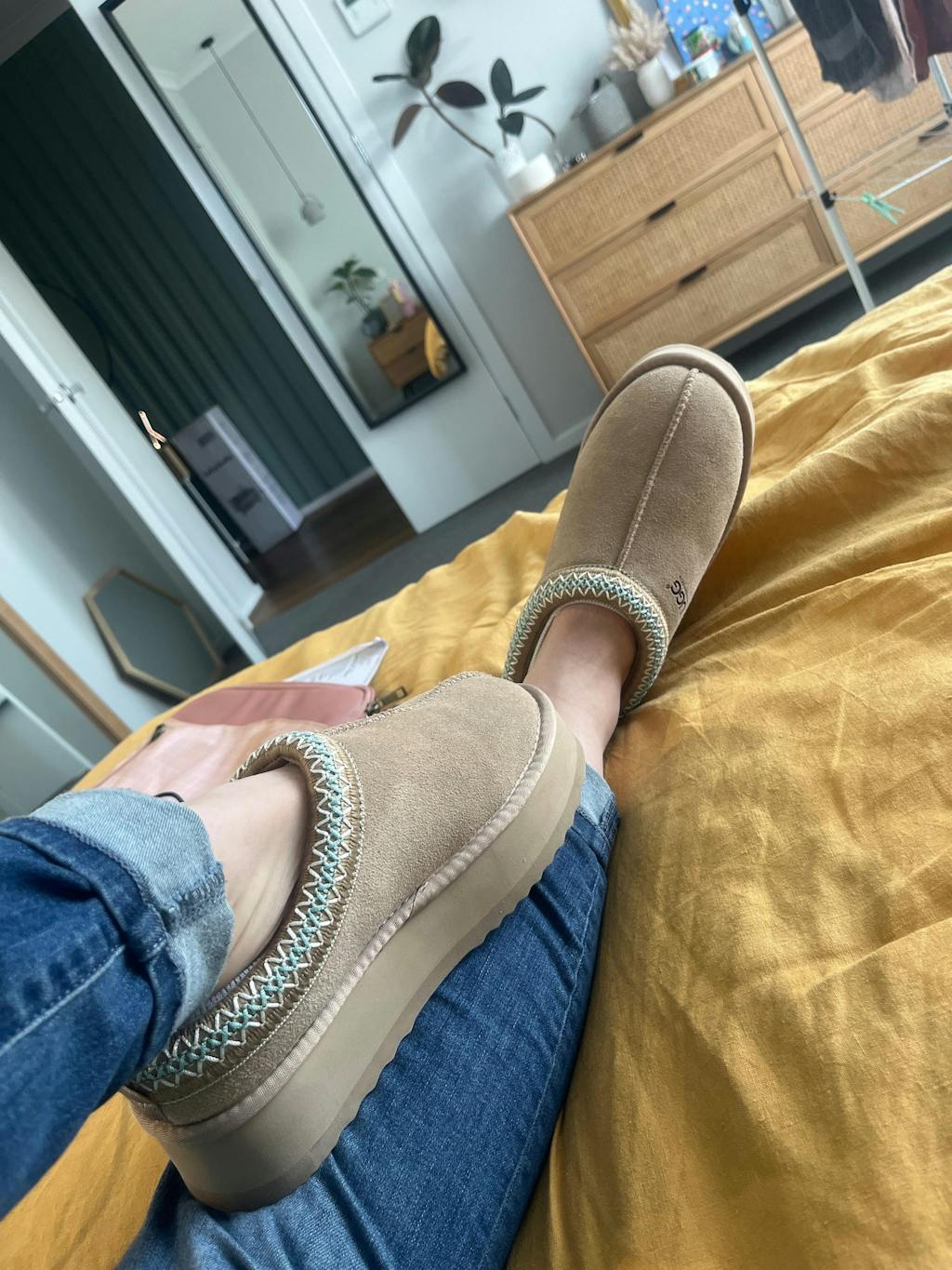 Step into comfort and style with our Alessia Platform Ugg Slippers. These slippers feature a chunky EVA combination platform sole for added height and support, while the soft sheepskin lining keeps your feet warm and cosy. The chic cross-stitch pattern on the ankle trim adds a touch of elegance, making them perfect for both indoor and outdoor wear.