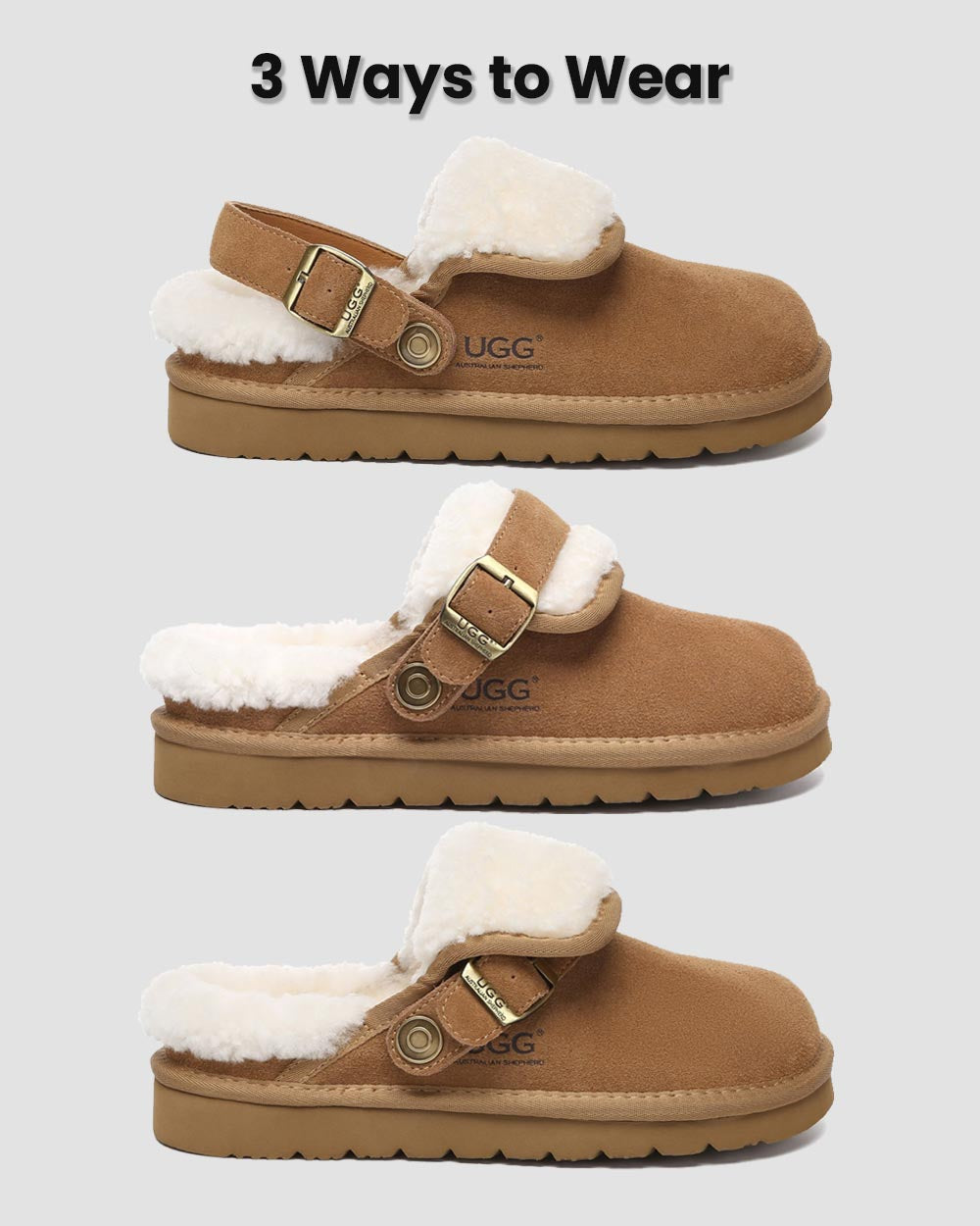 Slip into timeless comfort with the Tenley Ugg Slippers. Crafted from premium sheepskin wool, these slippers deliver unmatched softness, warmth, and breathability. The sleek slingback strap adjusts easily to the front or back, giving you versatile wear and a secure fit. Finished with a lightweight EVA sole, they provide cushioning and durability for both indoor lounging and outdoor errands. Available in classic Chestnut and Sand, they’re the perfect balance of luxury and everyday style.